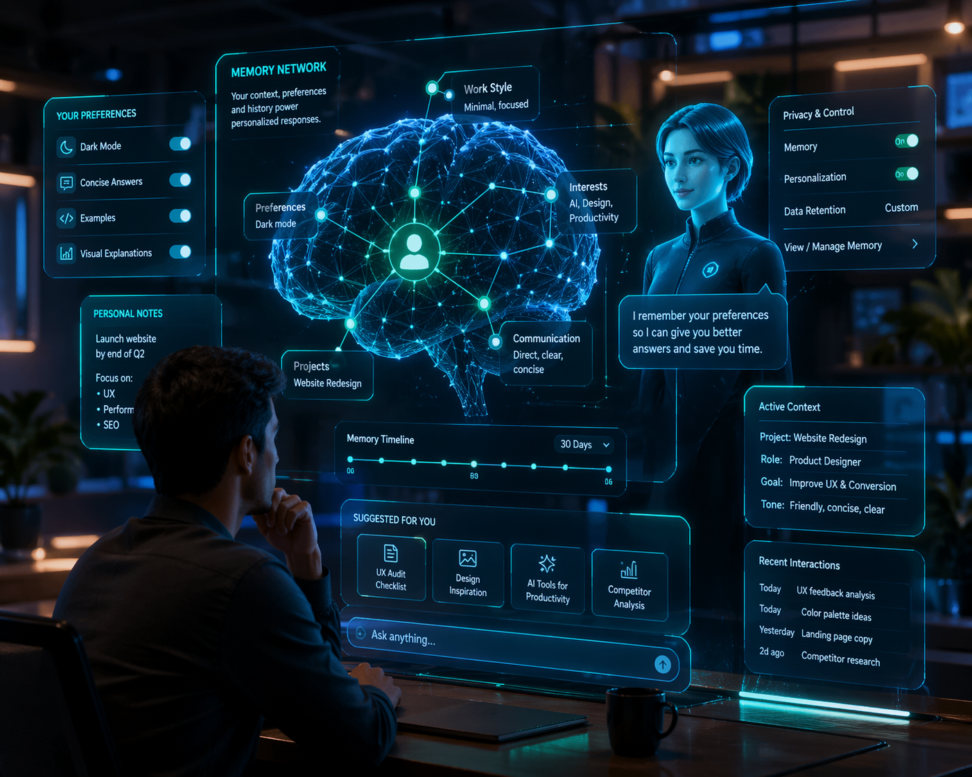 UX implication: Memory creates an intimacy contract. Users expect the system to remember accurately, forget gracefully, and explain why it recalled or ignored something. Poor memory UX leads to creepiness, confusion, or frustration when the AI misapplies outdated context. Product teams need explicit memory management interfaces, contextual recall indicators, and clear opt-in/opt-out flows.