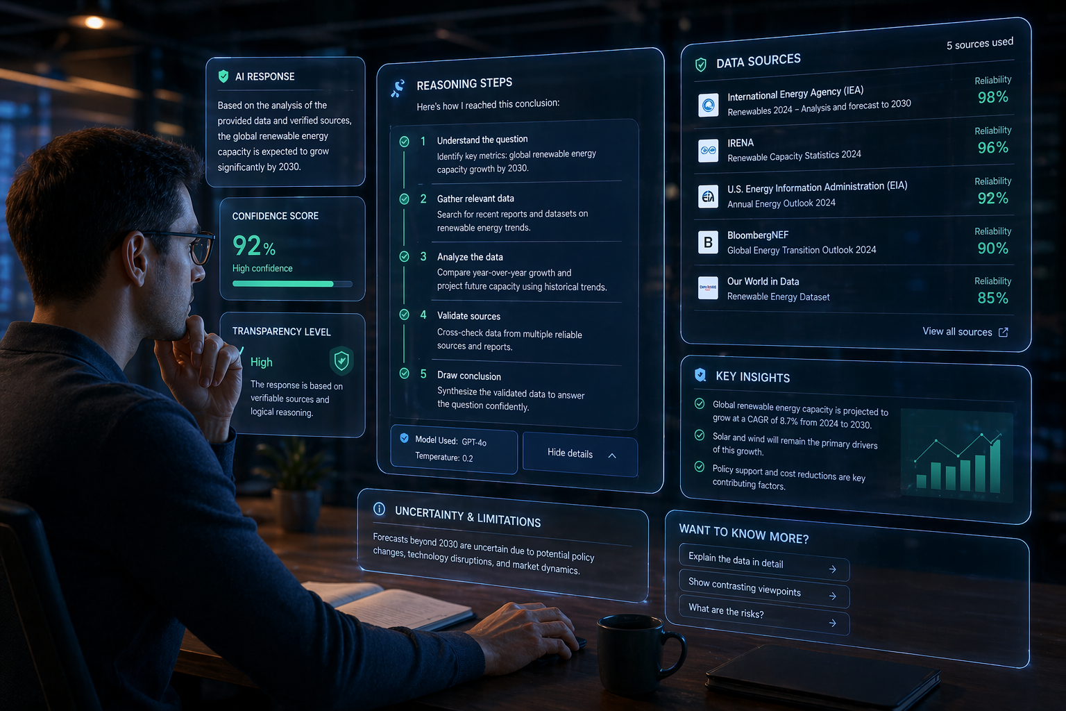 Recent updates emphasize step-by-step reasoning, source citations, and confidence indicators. Systems now show more of their internal logic, cite sources, and flag uncertainty. Enterprise tiers include audit logs, compliance checks, and role-based access controls.